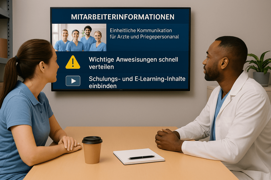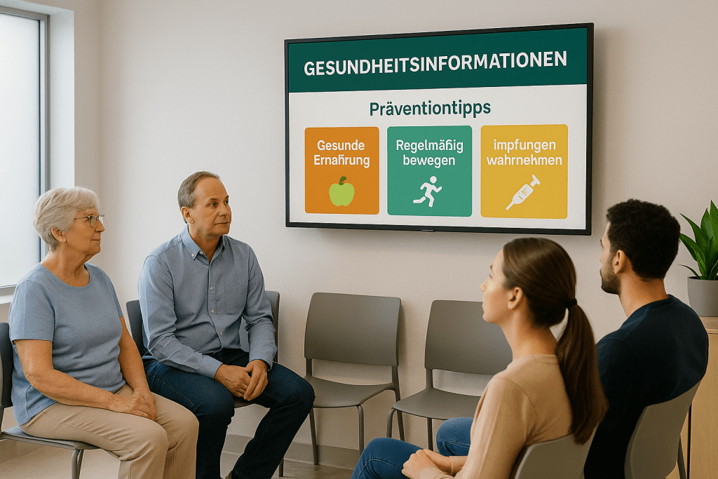 Nutzen Sie Wartezeiten sinnvoll. Auf Bildschirmen können Gesundheitsinformationen, Aufrufe, Servicehinweise oder Unterhaltungsinhalte angezeigt werden.