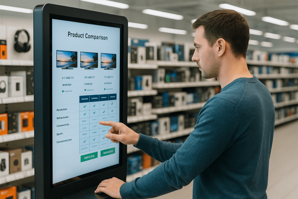 Interaktive Touchscreen-Terminals im Einzelhandel ermöglichen es Kunden, Produkte zu vergleichen, Verfügbarkeiten zu prüfen oder aktuelle Angebote zu finden – intuitiv und mehrsprachig bedienbar.