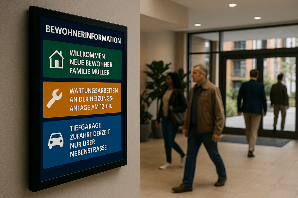 In Wohnanlagen oder gemischt genutzten Immobilien informieren Bildschirme zentral über Hausmitteilungen, Wartungsarbeiten oder Community-Events. Das spart Aushänge und Zettelwirtschaft.