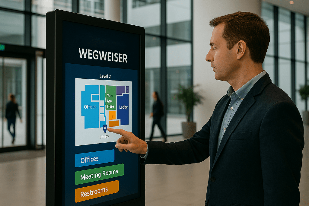 Besucher finden per interaktivem Touchscreen sofort den richtigen Raum, das richtige Büro oder den gewünschten Service. Ideal für große Bürokomplexe, Krankenhäuser oder Campus-Anlagen.