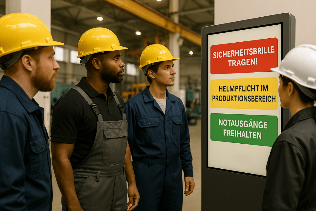 In der Industrie und im Handwerk zählen Effizienz, Sicherheit und klare Abläufe. Mit DSSHOW werden Informationen, Sicherheitsanweisungen und Produktionsdaten in Echtzeit auf Displays in Werkhallen, Produktionslinien oder Aufenthaltsräumen ausgespielt. Das Ergebnis: Bessere Kommunikation, mehr Sicherheit und höhere Produktivität.