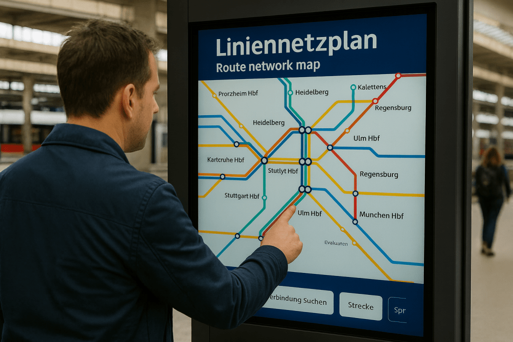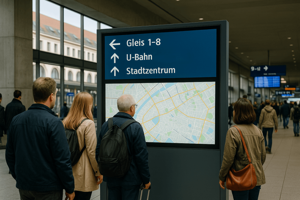 Interaktive Touchscreen-Infoterminals bieten Reisenden und Pendlern schnellen Zugriff auf Fahrpläne, Tickets, Umgebungsinformationen, Services und Werbeinhalte. Die Benutzerführung ist intuitiv und mehrsprachig.