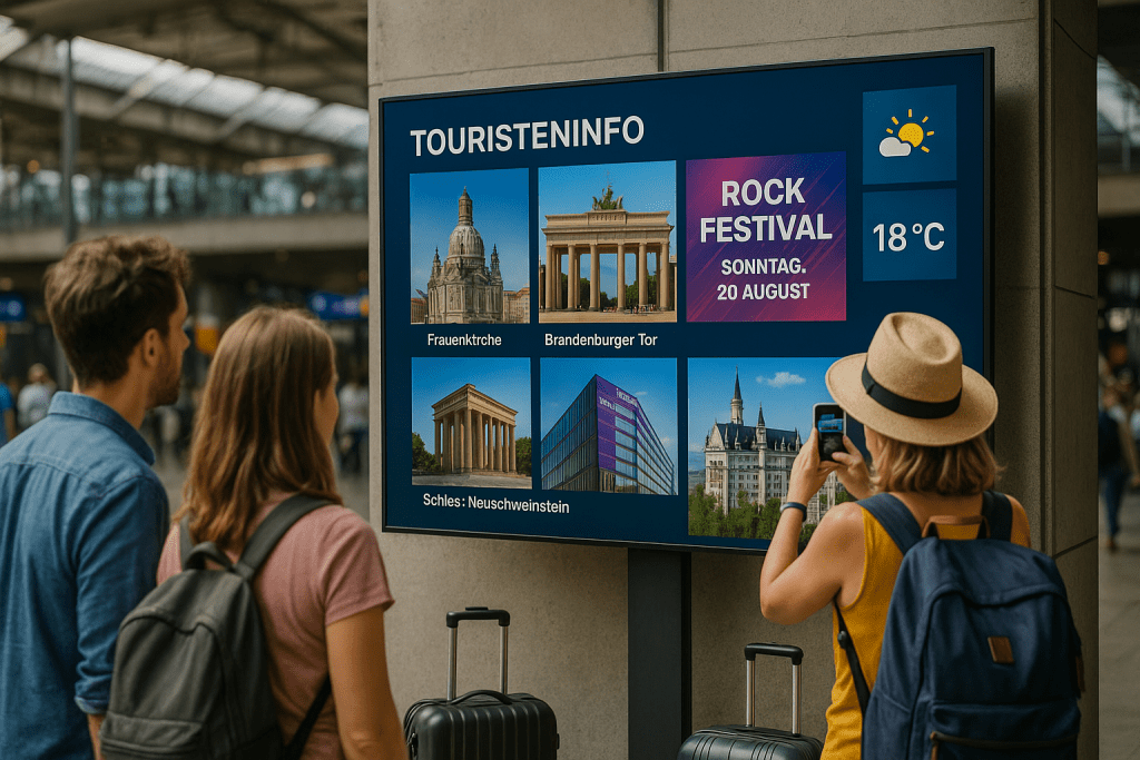 Digital Signage bezeichnet digitale Anzeigesysteme, die in Bahnhöfen, Bussen, Straßenbahnen oder Flughäfen eingesetzt werden, um Fahrgäste mit aktuellen Informationen, Werbung oder Notfallmeldungen zu versorgen.
