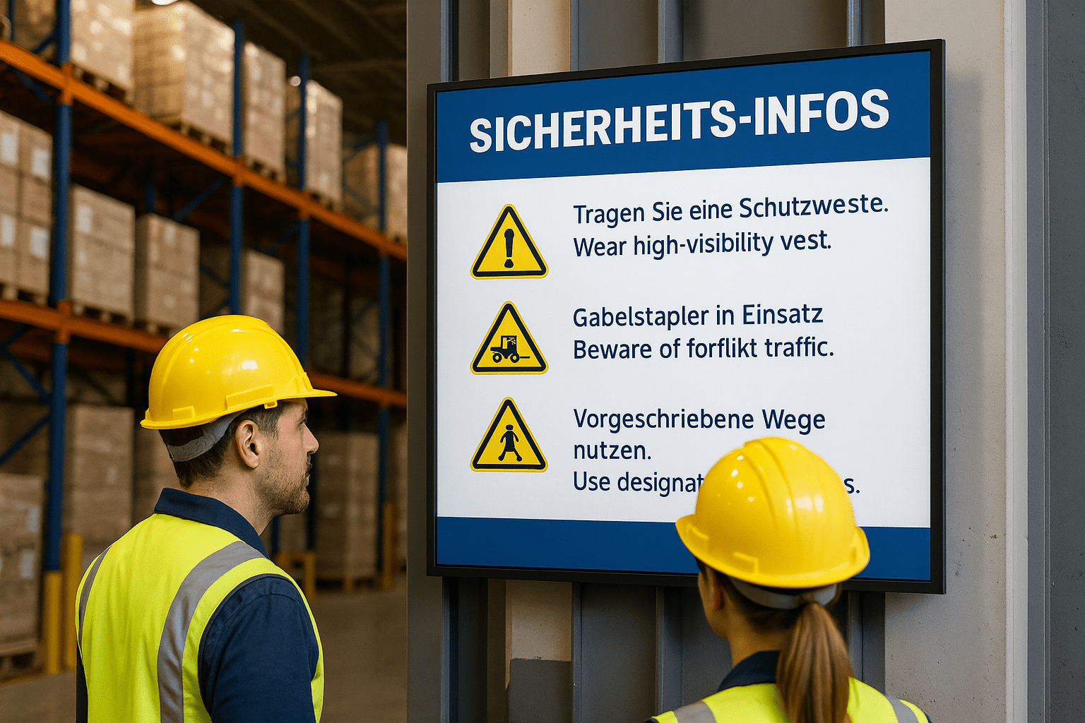 Zeigen Sie wichtige Arbeitsschutz-Informationen, Compliance-News oder Notfallanweisungen auf Bildschirmen – automatisch aktualisiert und standortspezifisch angepasst.