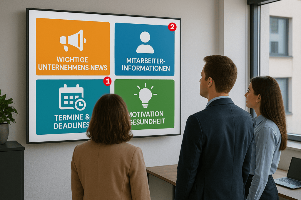 Digital Signage als modernes Schwarzes Brett: aktuelle Unternehmensnachrichten, interne Mitteilungen, Management-Updates oder Geburtstagsgrüße in Echtzeit auf Displays in Büros, Kantinen oder Produktionsstätten.