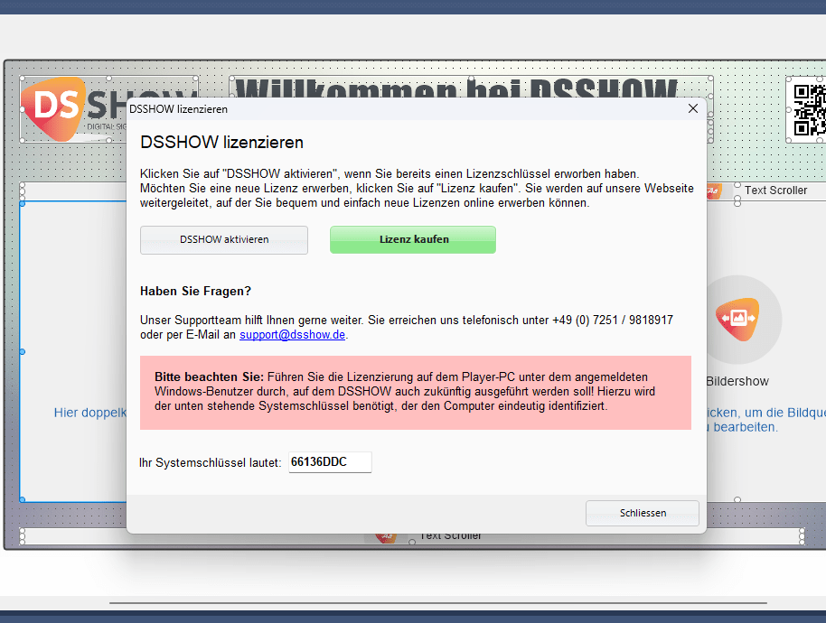Sie möchten für DSSHOW einen bestehenden LIZENZSCHLÜSSEL neu anfordern? Bitte nutzen Sie dazu dieses Online-Formular. Sie erhalten an Werktagen innerhalb von 24h Ihren neuen Lizenzschlüssel.